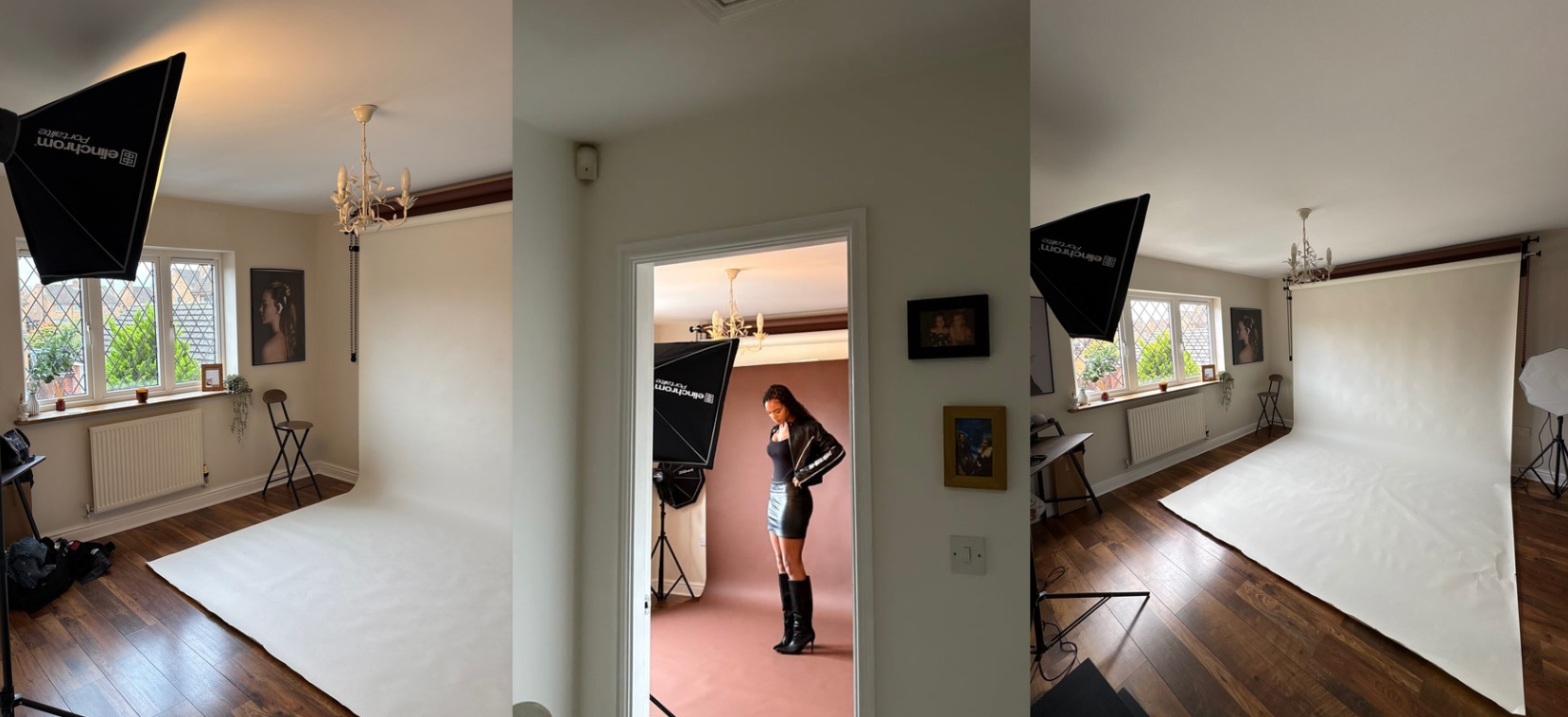 A bright, versatile home studio designed for fashion, beauty, and portrait photography. The space features a full-size seamless backdrop system with interchangeable colours, professional Elinchrom lighting, and ample room for both creative and e-commerce style shoots. Natural light fills the studio through large windows, offering soft ambient illumination alongside controlled studio setups.